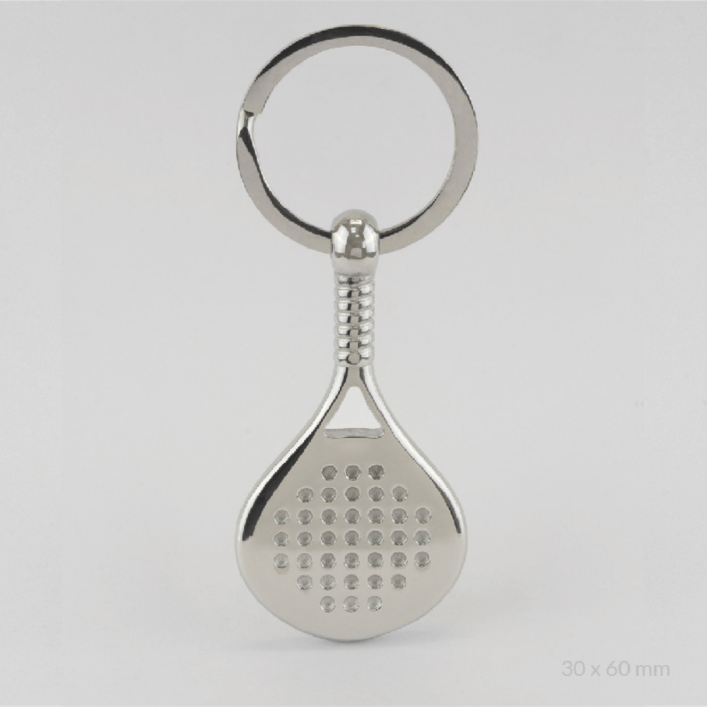 El elemento central del llavero es una pequeña pala de pádel con unas dimensiones aproximadas de 25 x 30 mm.